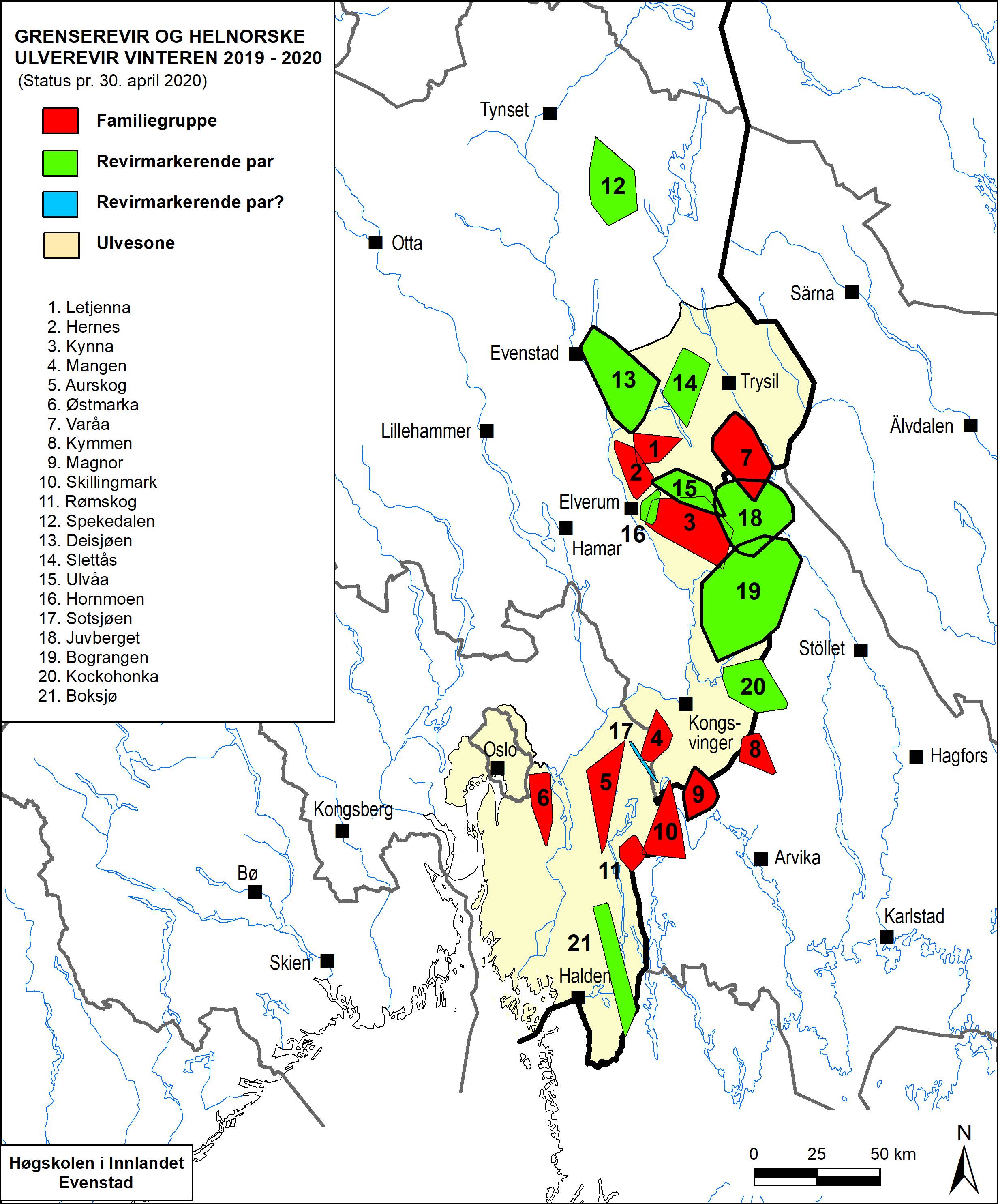 Kartet viser utbredelse av helnorske og svensk-norske ulverevir med familiegrupper og revirmarkerende ulvepar som er kartlagt pr. 30.april vinteren 2019-2020.