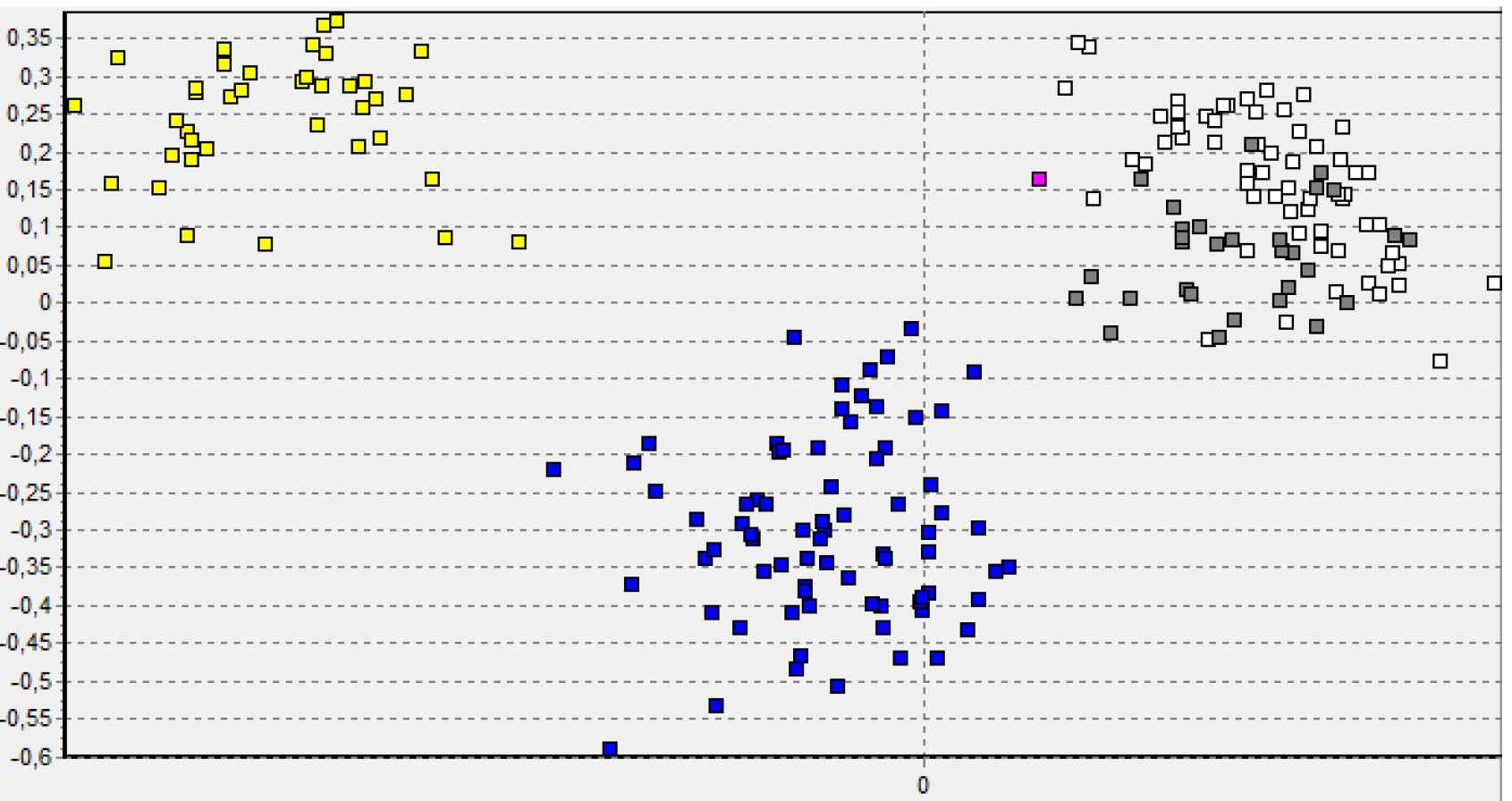 Figurtekst: Clustringsanalyse av den mye omtalte Elgåulven (rosa) mot referansemateriale av skandinaviske ulver (blå), finske ulver (hvit), ulver fra russisk Karelen (grå), og skandinaviske hunder (gul). Hver firkant representerer ett individ og avstanden mellom dem reflekterer relativt slektskap. Vi ser at Elgåulven grupperer tydelig sammen med de finske og russiske referanseulvene, og en kvantitativ test bekrefter at han med 99,9% sannsynlighet har opphav i den finskrussiske ulvebestanden. Se PDF her.