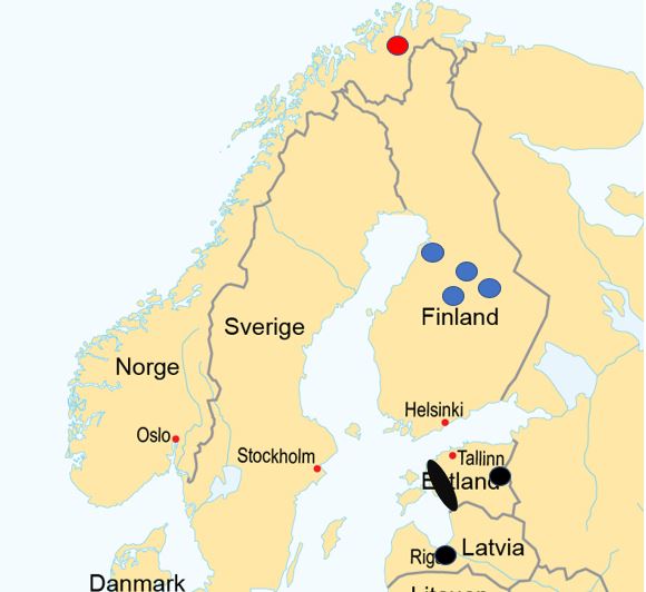 Kartet viser observasjoner av gullsjakal i Lakselv, Finnmark (rød) og i Finland (blå), i tillegg til det nærmeste kjente reproduksjonsområdet og territorielle individer i Baltikum (sort). Kart: Rovdata