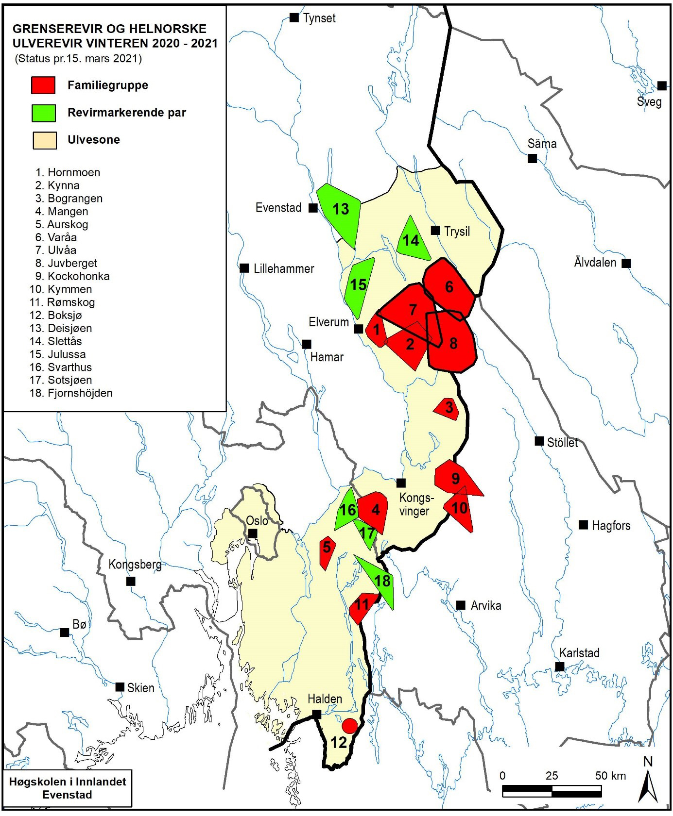 Kartet viser utbredelse av helnorske og svensk-norske ulverevir som foreløpig er kartlagt pr. 15. mars vinteren 2020-2021. De oppgitte revirgrenser er minimumsgrenser. Sirkel angir revir med utilstrekkelig informasjon om revirgrenser. Kart: Høgskolen i Innlandet