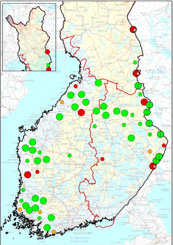Ulveflokker (store sirkler) og revirmarkerende par (mindre sirkler) registrert i Finland, mars 2021. Grønn = dokumentert flokk eller par; Oransje= sannsynlig flokk eller par; Rød = usikker flokk eller par. Kartet er hentet fra Heikkinen m.fl. Rapport 39, 2021; Viltforskningsinstituttet LUKE; Helsinki.
