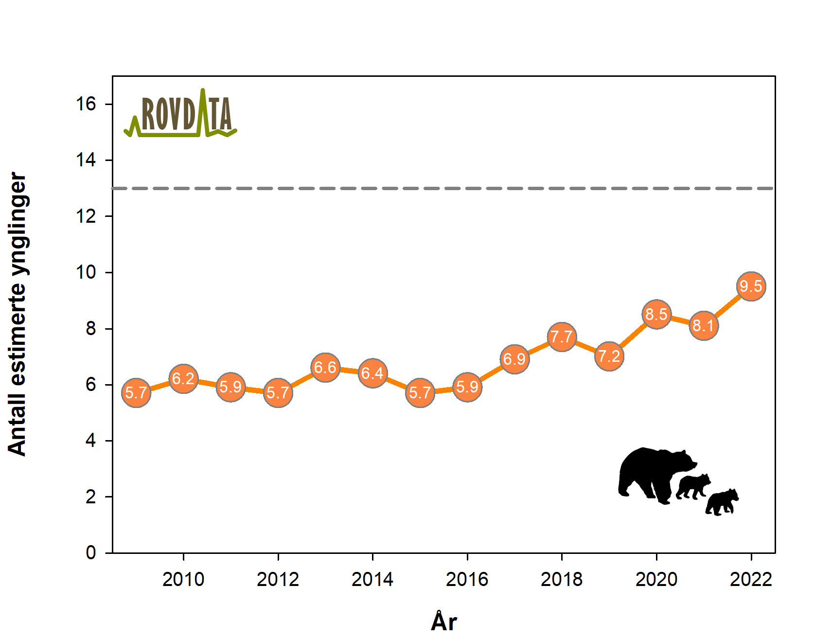 Figuren viser beregnet antall årlige ynglinger av brunbjørn i Norge for perioden 2009-2022. Stiplet horisontal linje angir den nasjonale bestandsmålsettingen på 13 årlige ungekull. Figur: Rovdata