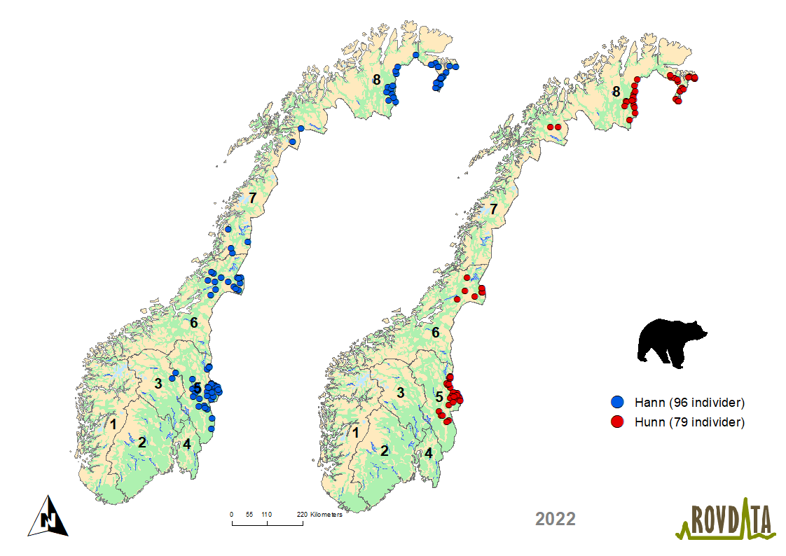 I fjor ble det påvist 175 brunbjørner innenfor landets grenser, hvorav 79 hunnbjørner og 96 hannbjørner. Dette er det høyeste antall individer og hunnbjørner som er påvist i landet siden den DNA-baserte overvåkingen ble landsdekkende i 2009. Les mer i denne nyhetssaken: Fortsatt økning i antall brunbjørn i Norge