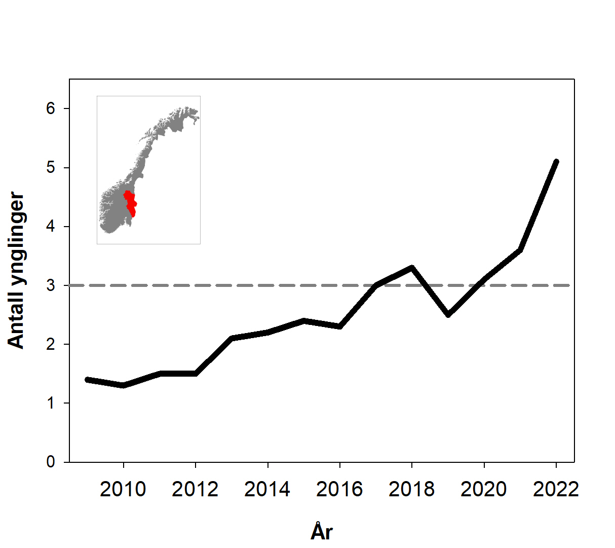 Det er hovedsakelig gamle Hedmark fylke (rovviltregion 5) som har bidratt til økning i antall ynglinger av bjørn de siste årene. Fra 2021 til 2022 økte antall estimerte kull fra 3,6 til 5,1 bjørnekull.