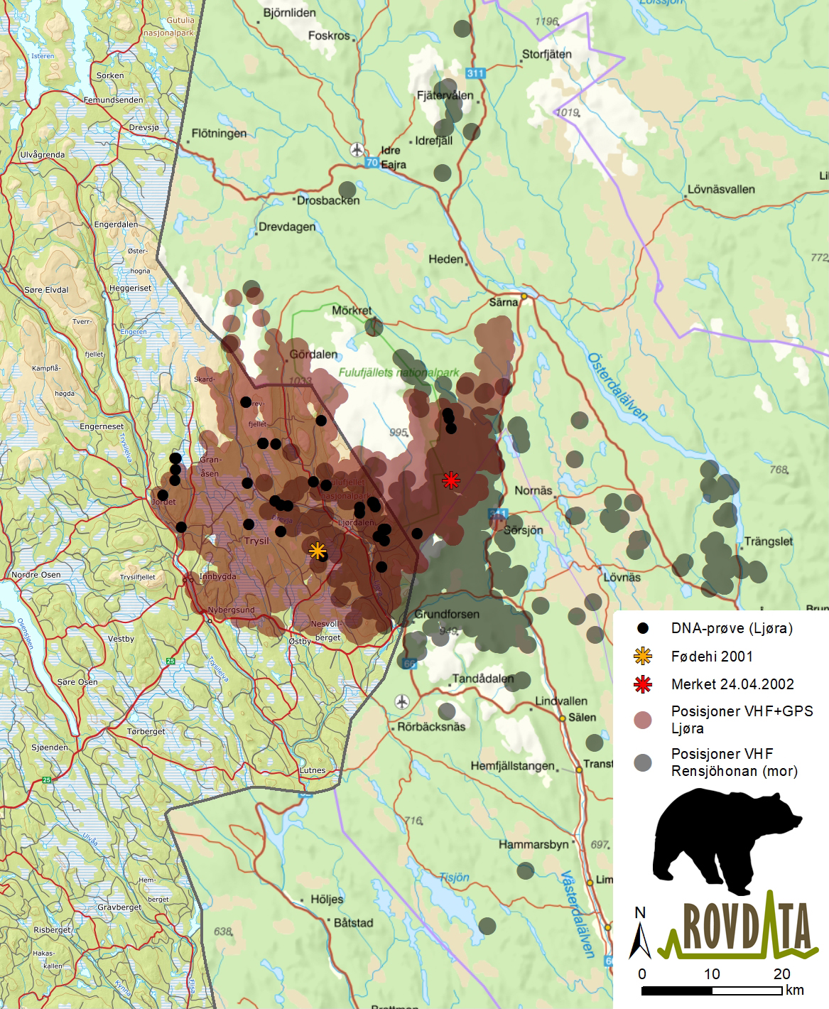 Data fra DNA-analyser av innsamlede prøver og fra radiomerking viser at bjørnebinna HE7, eller «Ljøra» som var navnet hun fikk i forbindelse med radiomerking i 2002, har levd hele 22 år i grensetraktene i Trysil.