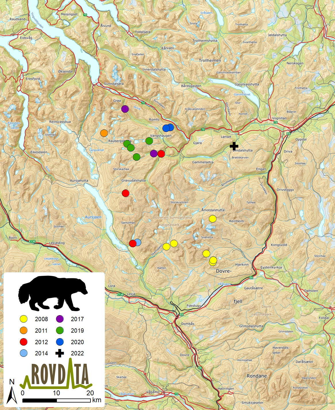 Jervetispa "Ind263" ble minst 14 år gammel og ble registrert på DNA en rekke steder på Dovrefjell fra 2008 og fram til den ble felt på lisensjakt i 2022. Kart Rovdata