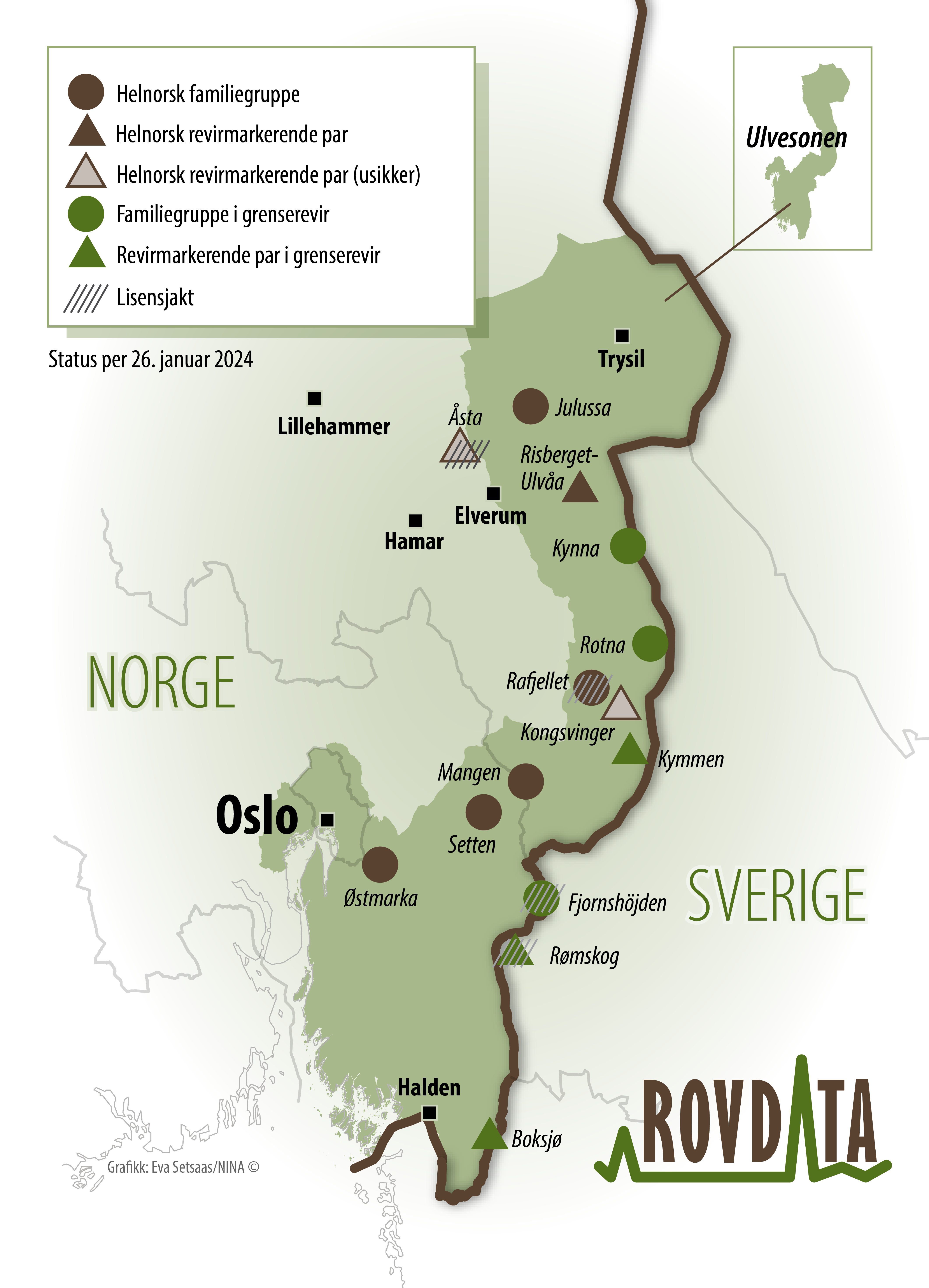 Kartet viser foreløpig status pr. 26 januar for helnorske og svensk-norske ulverevir vinteren 2023-24. Kart: Rovdata