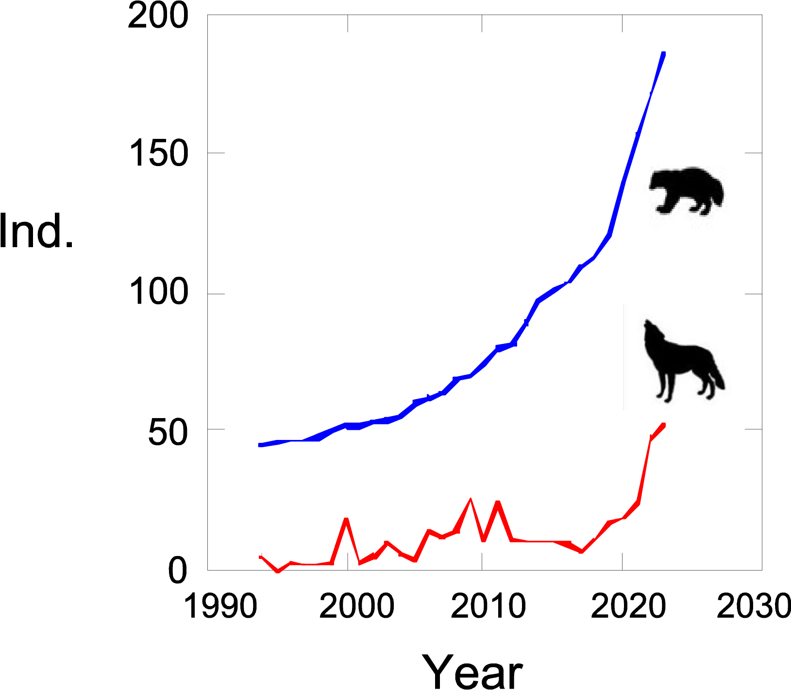 Antall felte ulver i reindriftsområdet i Nord-Finland og anslått bestandsstørrelse av jerv i samme område. Illustrasjon: Ilpo Kojola, Professor Emeritus, LUKE (Naturressursinstituttet, Finland).