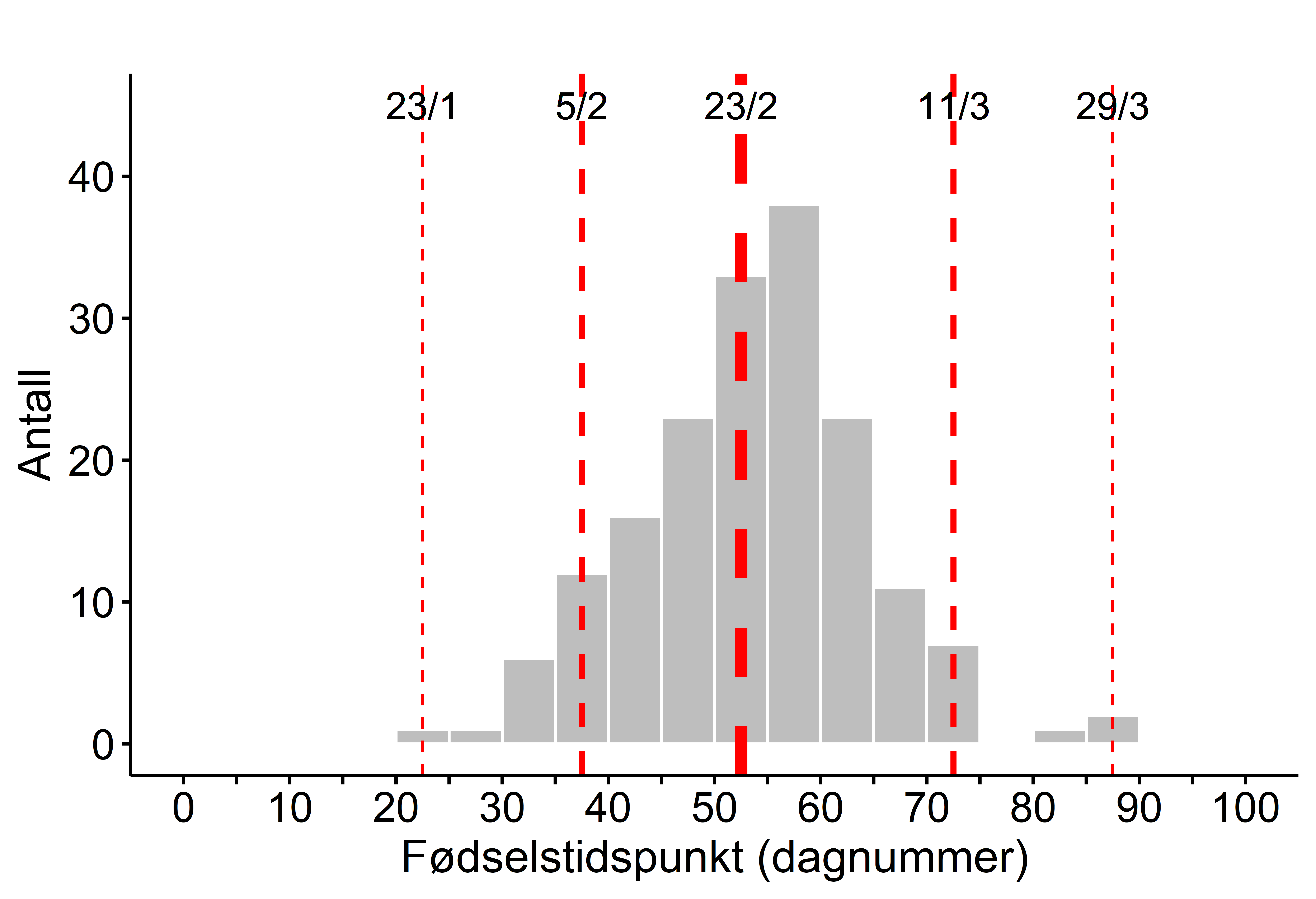 Fordeling av fødselstidspunkt for 174 jervekull i Norge i perioden 2001-2022. Figur: Norsk institutt for naturforskning (NINA)