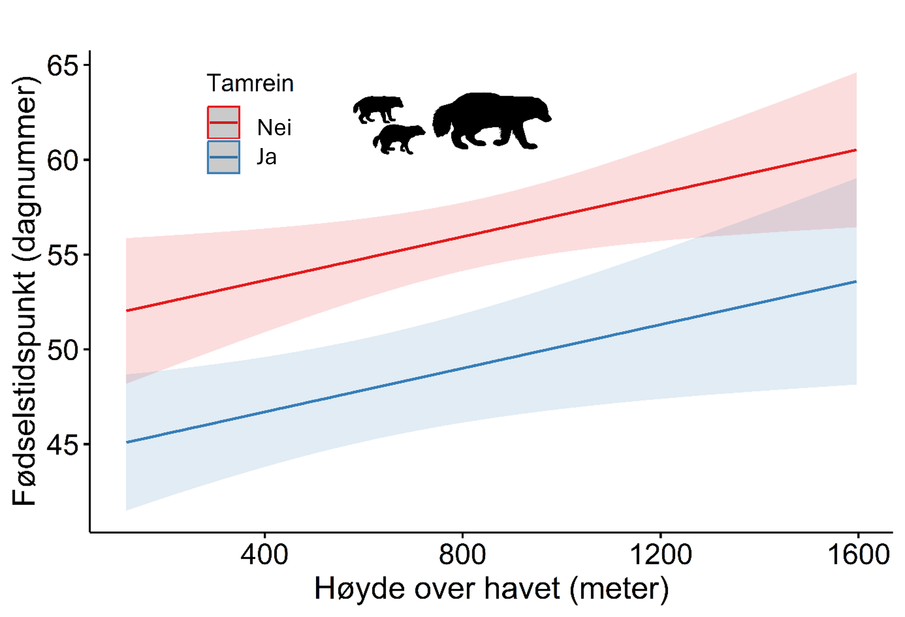 Effekten av tamrein vinterbeite områder og høyden over havet på fødselstidspunkt hos jerv. Figur: Norsk institutt for naturforskning (NINA)