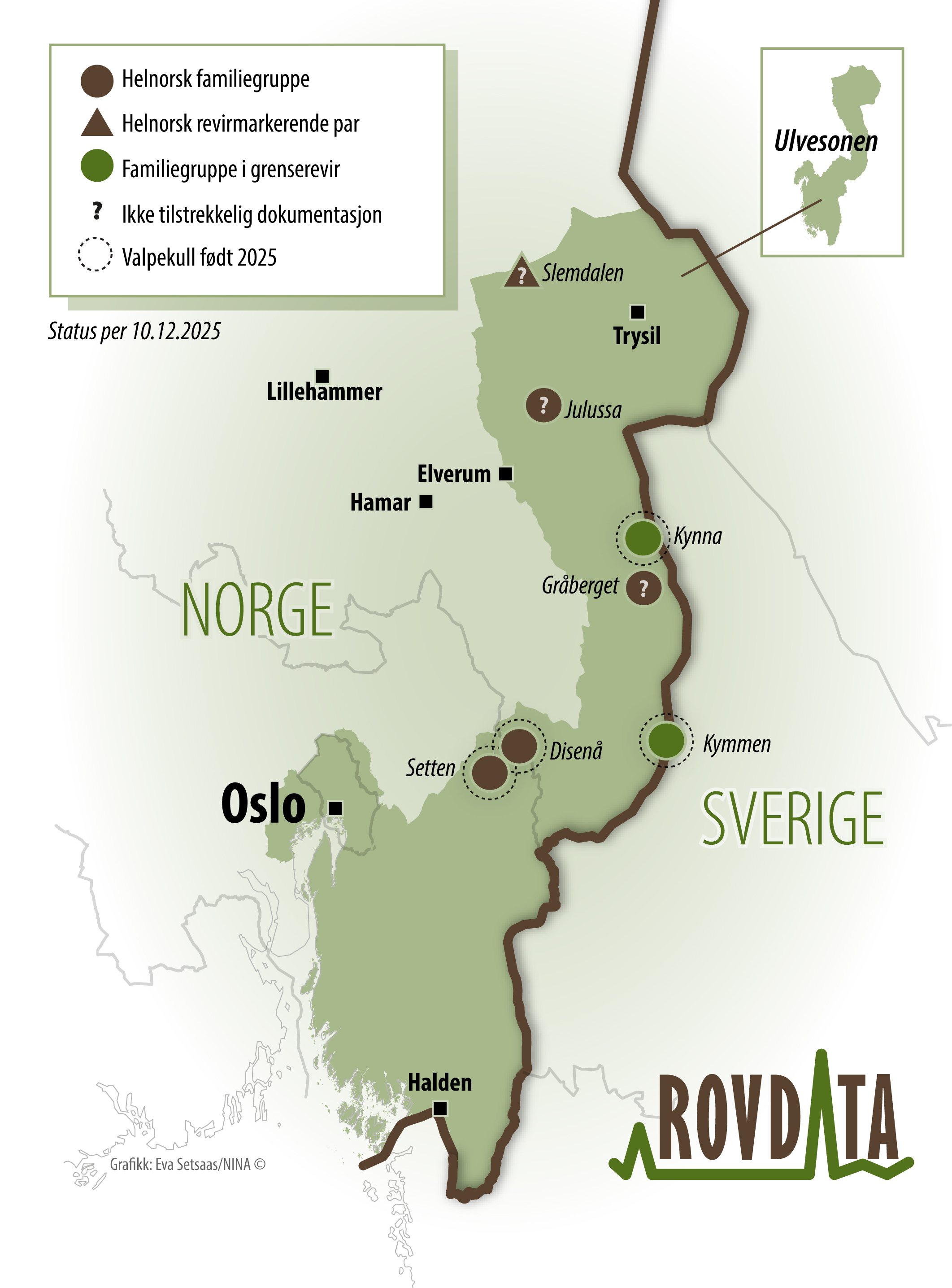 Kartet viser foreløpig status for helnorske og svensk-norske ulverevir per. 10. desember 2025. Kart: Rovdata