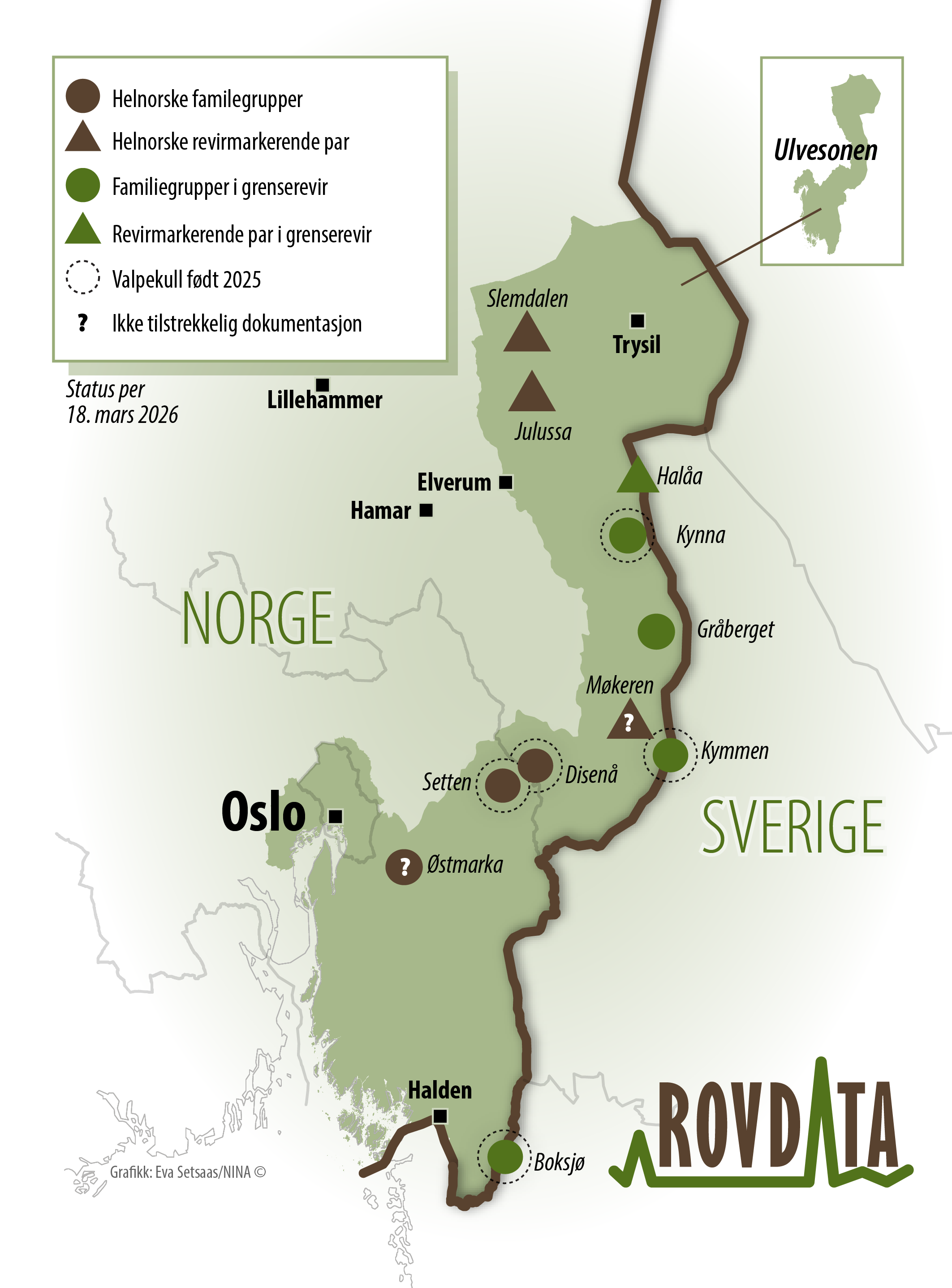Kartet viser foreløpig status for helnorske og svensk-norske ulverevir per. 18. mars 2026. Kart: Rovdata